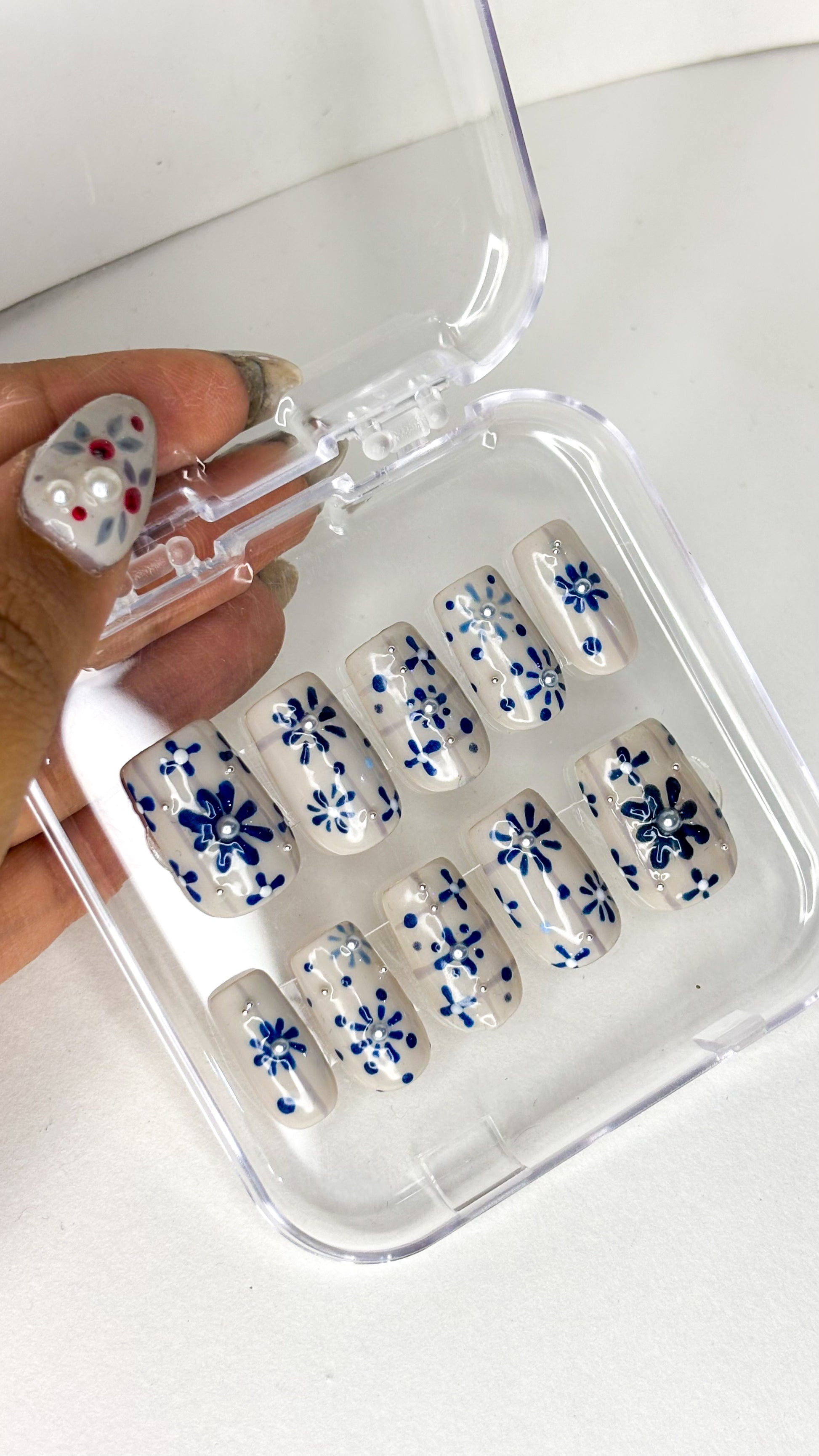Hand-painted blue floral press-on set — XS size.